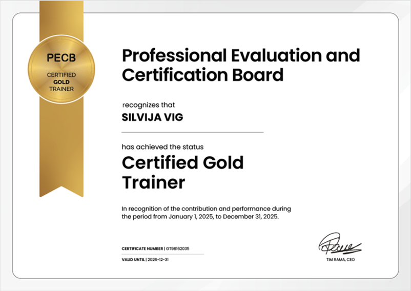 Dr. sc. Silvija Vig stekla je status PECB Gold Trainer za 2025. godinu za područje ISO 37301 – Compliance Management Systems, čime je potvrđen njezin kontinuirani rad na razvoju i jačanju prakse upravljanja usklađenošću te edukaciji stručnjaka koji se u organizacijama bave Compliance-om.