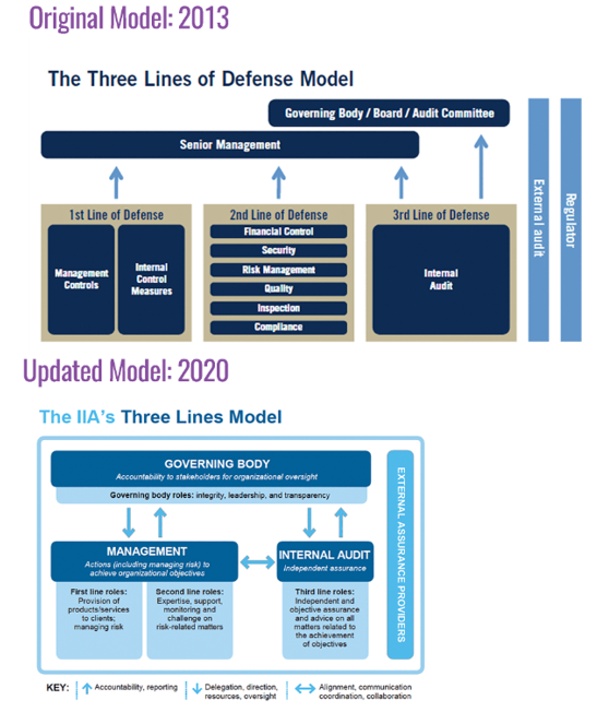 Dugi niz godina model Tri linije obrane služio je kao temelj za strukturiranje rizika i kontrolnih mehanizama. Jasno je razdvajao poslovne jedinice kao prvu liniju, nadzorne funkcije poput Compliance-a i upravljanja rizicima kao drugu liniju te internu reviziju kao treću, neovisnu liniju. Iako je taj model postavio nužne okvire odgovornosti, u praksi je često stvarao organizacijske silose. Zato je Institute of Internal Auditors 2020. modernizirao ovaj okvir u model Tri linije, koji zadržava razdvajanje uloga, ali snažnije naglašava suradnju, koordinaciju i stvaranje vrijednosti kao zajednički cilj svih linija.